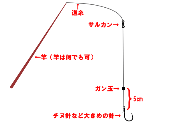仕掛けに使うのは、サルカン・ガン玉・大きめの釣り針のみ。